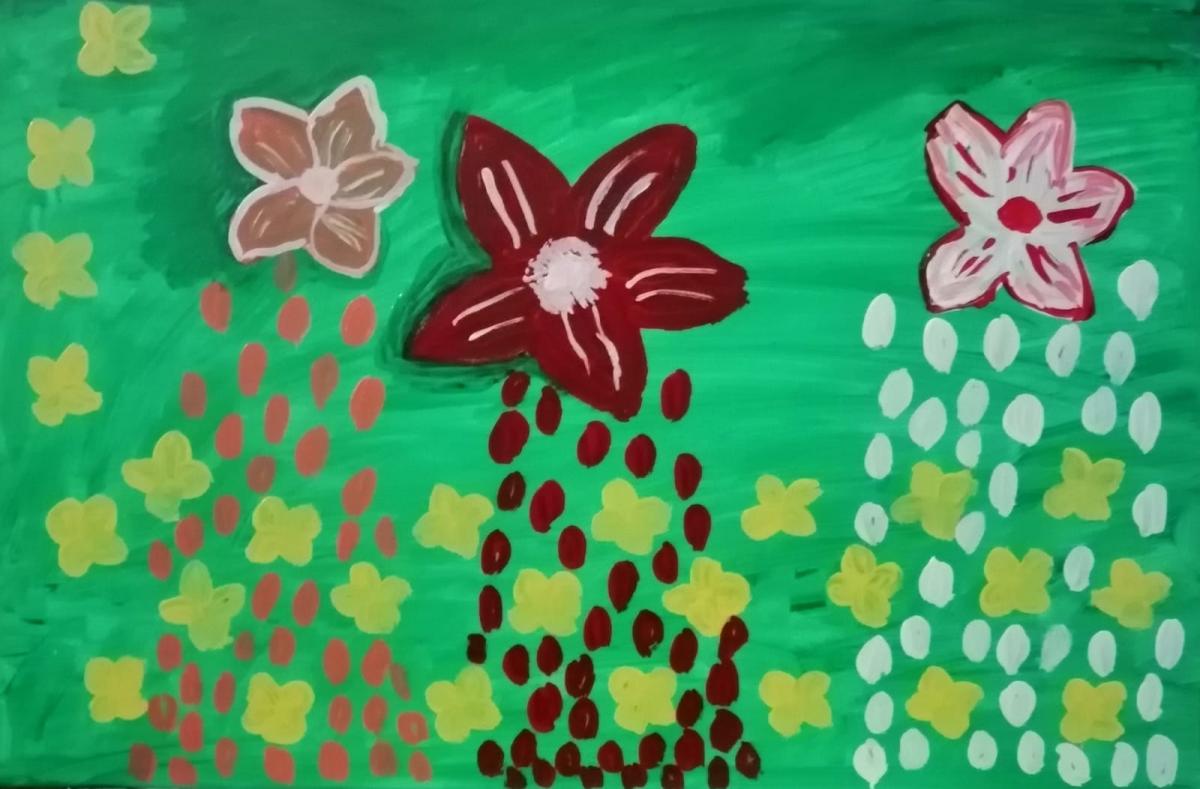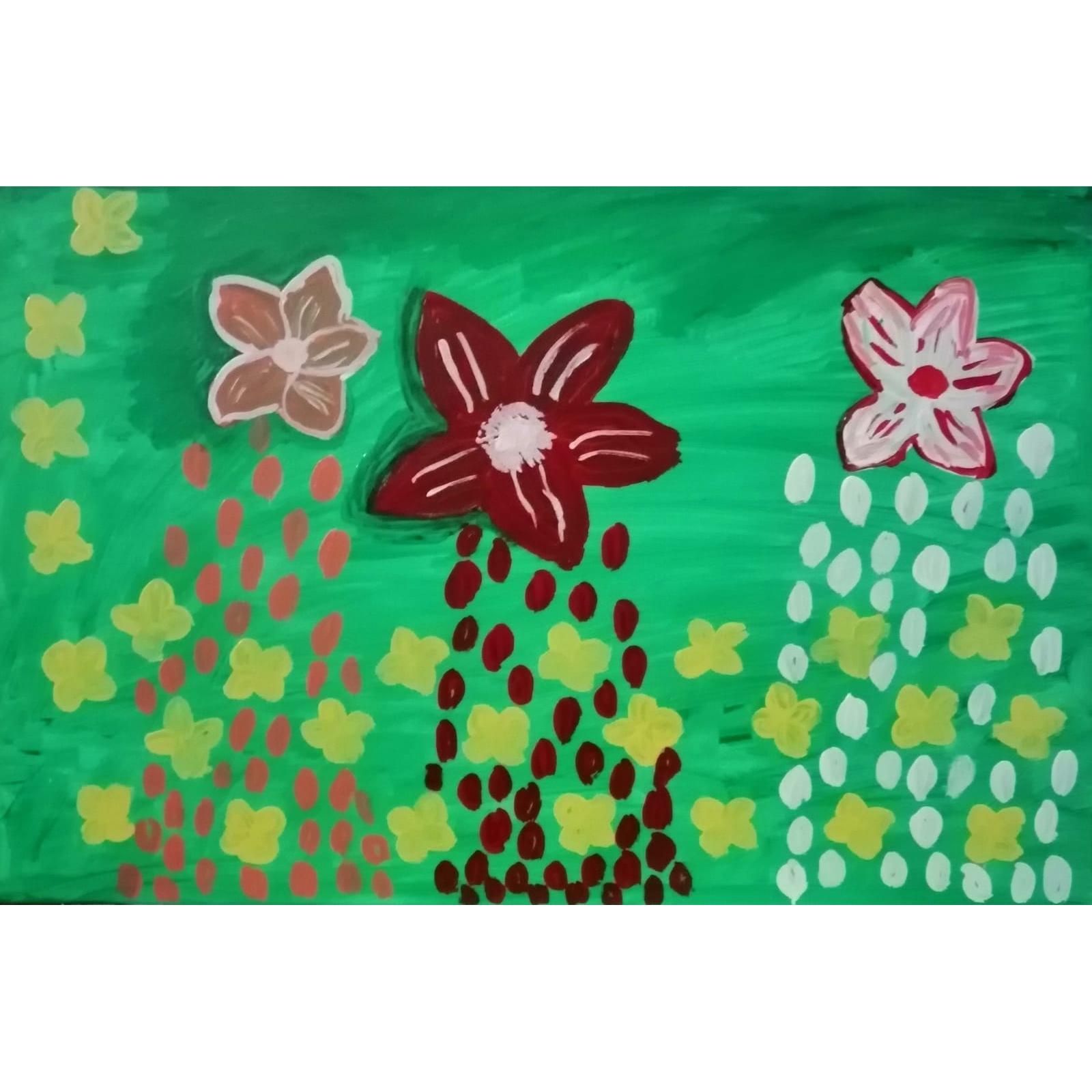 Questo lavoro si presenta come una composizione decorativa dal forte impatto cromatico, giocata su contrasti tra il verde dello sfondo e i colori caldi e vivaci dei fiori e degli elementi decorativi. Le tre grandi corolle centrali, stilizzate, suggeriscono vitalità e centralità emotiva, mentre i segni ripetuti attorno – ovali, puntini, fiori più piccoli – creano una pioggia visiva che richiama l’idea di semina, fioritura o energia che si espande.